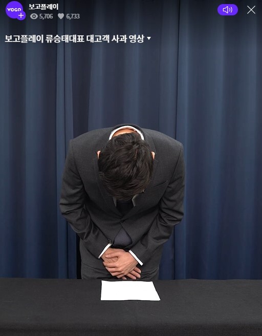 ▲ 고객들에게 고개 숙여 사과하는 류승태 보고플레이 대표 [보고플레이 홈페이지 캡처] |