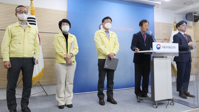 ▲ 이동희 식품의약품안전평가원장(왼쪽 세번째)과 오일환 중앙약사심의위원회 위원장(오른쪽 두번째) 등 배석자들이 5일 오전 충북 청주시 식품의약품안전처에서 열린 아스트라제네카의 코로나19 백신 중앙약사심의위원회 자문 회의 결과 발표를 마친 뒤 취재진의 질문에 답변하고 있다. [청주= 연합뉴스] |