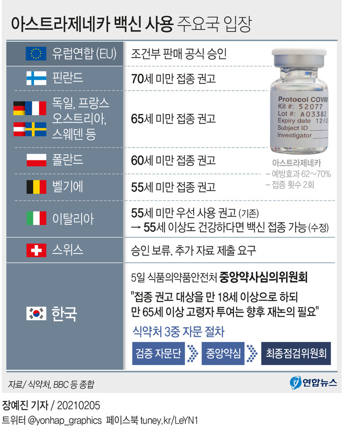 하지만 독일, 프랑스 등 일부 국가는 EU의 허가사항과는 별도로 고령층에 대해 접종을 제한해야 한다는 권고를 내렸다. 스위스에서는 아예 아스트라제네카 백신의 승인을 보류했다.