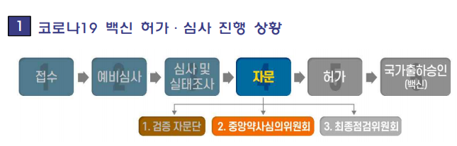 식약처는 코로나19 치료제와 백신의 객관적이고 공정한 허가심사를 위해 ‘코로나19 백신 안전성 및 효과성 검증 자문단’(검증 자문단), 중앙약심, 최종점검위원회로 이어지는 '3중'의 전문가 자문 절차를 밟고 있다.