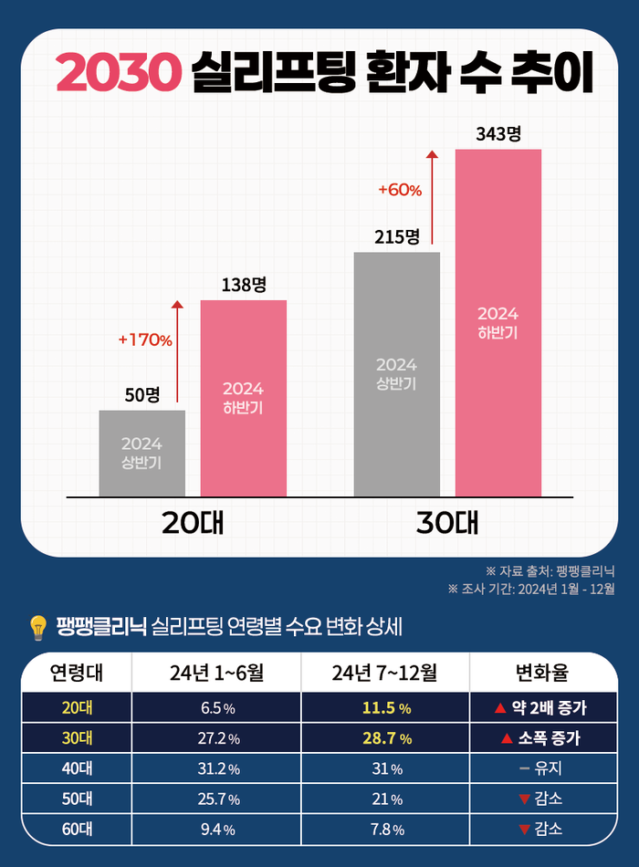 실리프팅 특화 의료기관 팽팽클리닉(팽팽의원)이 지난해 동안의 실리프팅 연령별 데이터를 분석한 결과, 이 해 하반기 20대가 차지하는 비중은 11.5%로 같은 해 상반기(6.5%) 대비 약 2배 증가했다. 같은 비교로 환자 수는 50명에서 138명으로 약 2.7배 올랐다.
