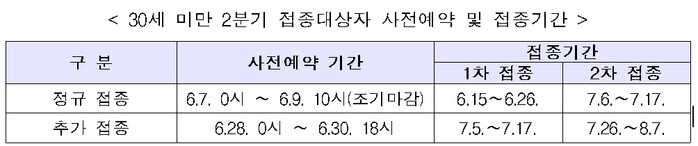 ▲ 30세 미만 2분기 접종대상자 사전예약 및 접종기간. [출처=코로나19 예방접종 대응 추진단] |