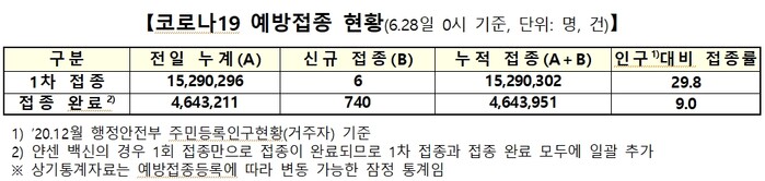 추진단에 따르면, 28일 0시 기준으로 신규 접종은 6명만 추가돼 지금까지 총 1529만302명이 코로나19 백신 1차 접종을 받았다고 밝혔다. 전국민 대비로는 29.8%이다.