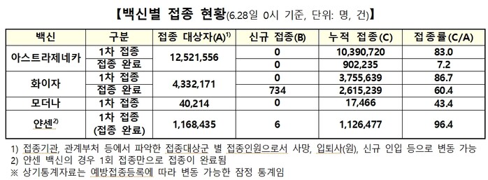 ▲ 28일 0시 기준 백신별 접종 현황. [출처=코로나19 예방접종 대응 추진단] |