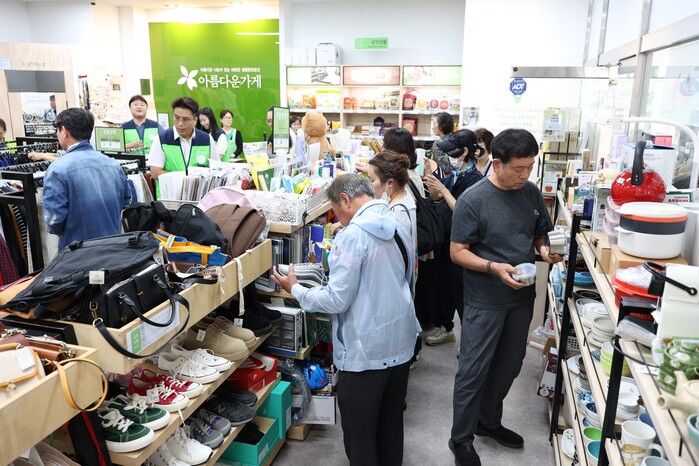 ▲지난 9월24일 아름다운가게 부산명륜역점에서 열린 ‘도시철도 개통 40주년 사랑나눔 바자회’ 행사장을 시민들이 둘러보고 있다. |