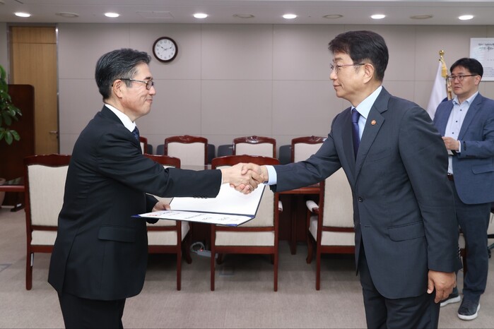 | ▲박상우 국토교통부 장관은 14일 오전 정용식 한국교통안전공단 신임 이사장에게 임명장을 전수 후 악수를 나누고 있다. |
