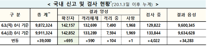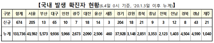 중앙방역대책본부(본부장 정은경 청장)는 4일 0시 기준으로, 국내 발생 신규 확진자는 674명, 해외유입 사례는 21명으로 하루 신규 확진자가 총 695명 발생했다고 밝혔다. 전날(681명)보다 14명 늘면서 사흘 연속 600명대 후반을 나타냈다.