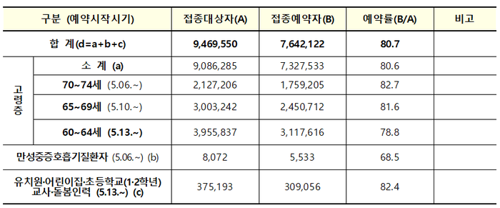 이외에 유치원·어린이집·초등학교 1·2학년 교사·돌봄인력의 예약률은 82.4%(37만5193명 중 30만9056명), 만성중증호흡기질환자 예약률은 68.5%(8072명 중 5533명)로 각각 나타났다.