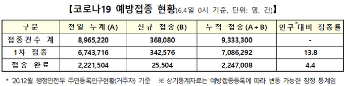 예방접종 상황을 보면, 4일 0시 기준으로 전날 하루 36만8080명이 코로나19 백신을 맞았다.