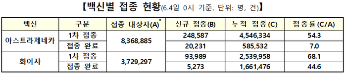백신별로는 전날 하루 아스트라제네카 1차 접종 24만8587명(누적 454만6334명), 접종 완료 2만231명(누적 58만5532명)이었고, 화이자는 1차 접종 9만3989명(누적 253만9958명), 접종 완료 5273명(누적 166만1476명)이었다.