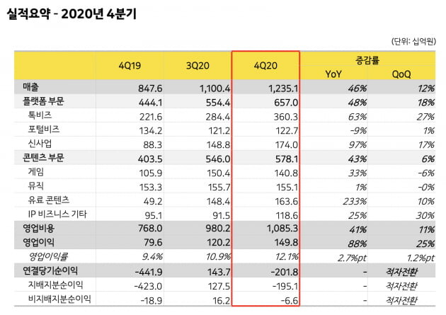 4분기 연결 매출은 전분기 대비 12%, 전년 동기 대비 46% 증가한 1조2,351억원이며, 영업이익은 전분기 대비 25%, 전년 동기 대비 88% 성장한 1,498억원을 기록했다.