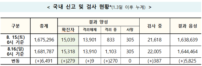 ▲ 16일 0시 기준 코로나19 국내 신고 및 검사 현황. [출처= 중앙방역대책본부] |