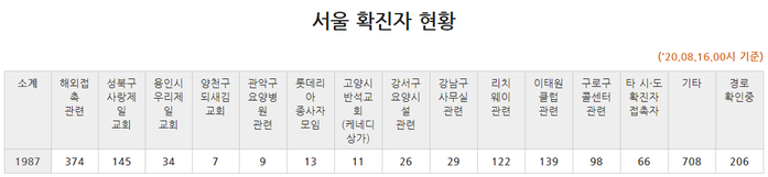 ▲ 16일 0시 기준 코로나19 서울 확진자 현황. [출처= 서울시] |