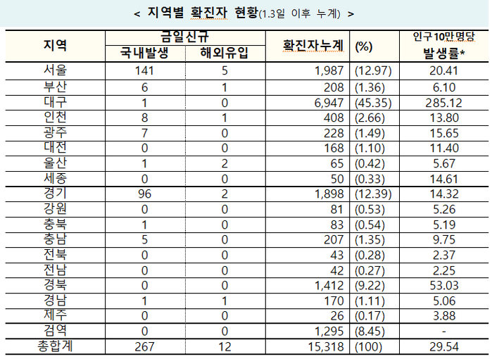 279명 중 대다수를 차지한 것은 국내 지역발생 환자였다. 해외유입 12명을 제외한 267명은 모두 지역발생 환자였다. 지역발생 확진자 수 역시 3월 8일(366명) 이후 가장 많은 수치다.
