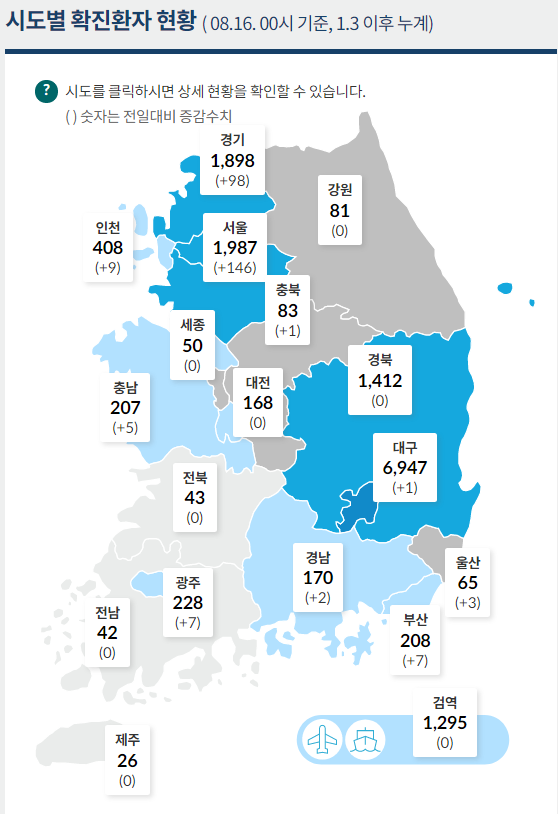 ▲ 16일 0시 기준 코로나19 시도별 확진환자 현황. [출처= 중앙방역대책본부] |