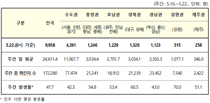 ▲ 22일 0시 기준 주간 일평균 확진자 수. [중앙방역대책본부 제공] |