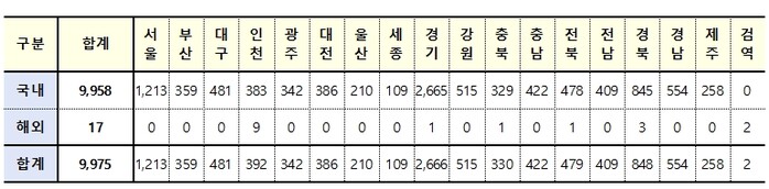 이날 신규 확진자 중 9958명은 국내 지역발생(국내감염)이고, 나머지 17명은 해외유입 사례다.