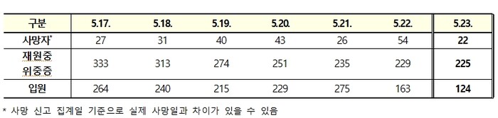 사망자도 전날(54명)보다 32명 줄어 22명이었다. 사망자 수는 지난달 30일(70명)부터 24일 연속 두 자릿수를 보이고 있다.사망자를 연령대로 보면 80세 이상이 11명으로 절반을 차지했고, 이어 70대 8명, 60대 2명, 50대 1명이었다.