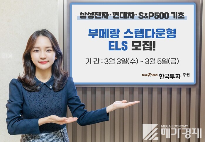 [메가경제=황동현 기자] 한국투자증권(사장 정일문)은 오는 5일까지 삼성전자·현대차·S&P500을 기초자산으로 하는 온라인 전용 부메랑 스텝다운형 TRUE ELS 13820회 투자자를 모집한다고 3일 밝혔다.