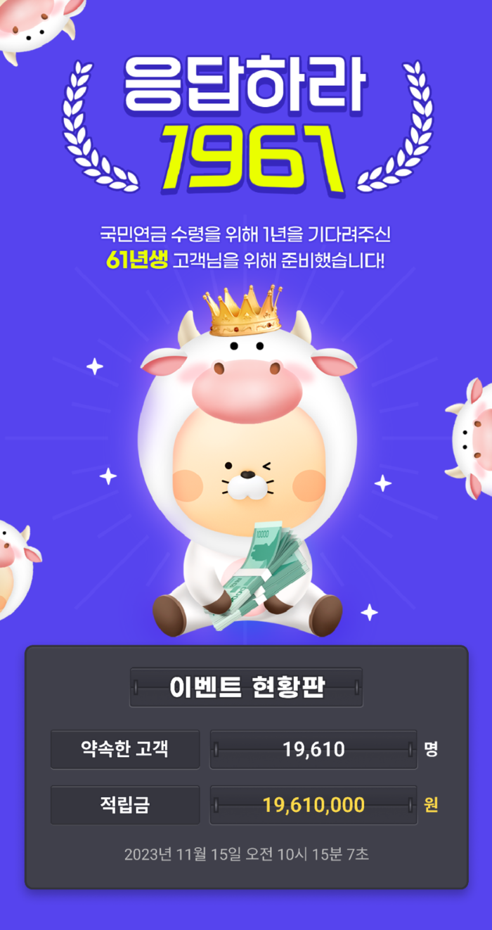 국민연금 수령은 출생연도에 따라 개시연도가 다르게 적용되는데 2024년부터 국민연금을 수령하는 1961년생 고객들이 이번 이벤트의 대상이다.