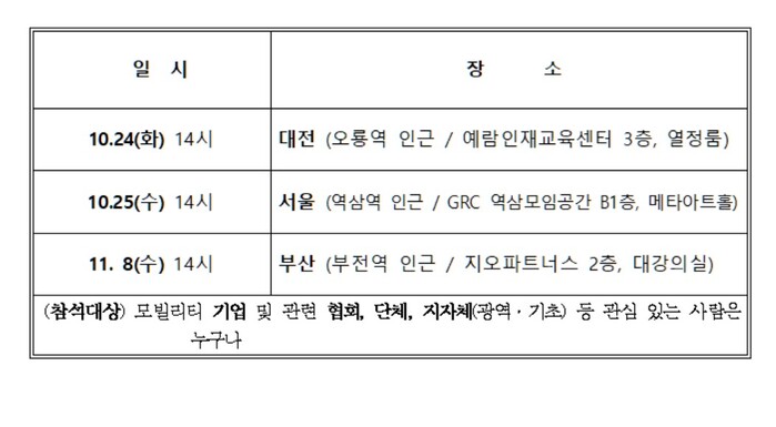 ▲모빌리티 규제샌드박스 권역별 설명회 개최계획 |