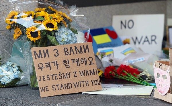 | ▲ 러시아의 우크라이나 무력 침공이 계속되고 있는 가운데, 지난 3일 오후 서울 용산구 주한우크라이나대사관 입구에 우리나라 시민들과 우크라이나 교민들이 쓴 응원 메시지와 꽃다발 등이 놓여있다. [서울=연합뉴스] |