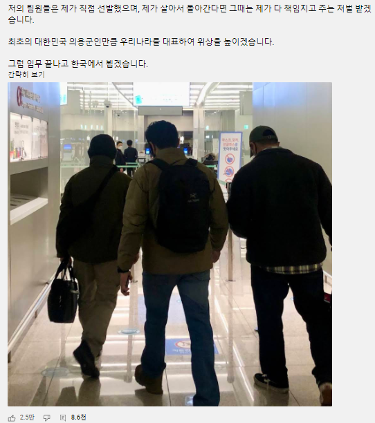 그러면서 “팀원들은 제가 직접 선발했으며, 제가 살아서 돌아간다면 그때는 제가 다 책임지고 주는 처벌 받겠다”며 “최초의 대한민국 의용군인만큼 우리나라를 대표하여 위상을 높이겠다”고 했다.