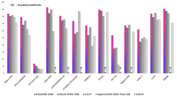 'K-엑사원'은 독자 파운데이션 모델 프로젝트 1차 평가에서 13개 벤치마크 중 10개 항목 1위를 차지하며 평균 72점을 기록, 5개 정예팀 모델 가운데 최고 성능을 입증했다.