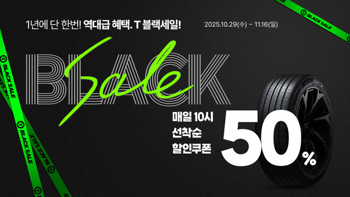[메가경제=주영래 기자] 한국타이어앤테크놀로지(대표이사 안종선·이상훈, 이하 한국타이어)가 국내 최대 쇼핑 축제인 ‘2025 코리아세일페스타’에 맞춰 온라인 타이어 쇼핑몰 티스테이션닷컴에서 ‘T-블랙세일(T-Black Sale)’ 프로모션을 오는 11월 16일까지 진행한다.
