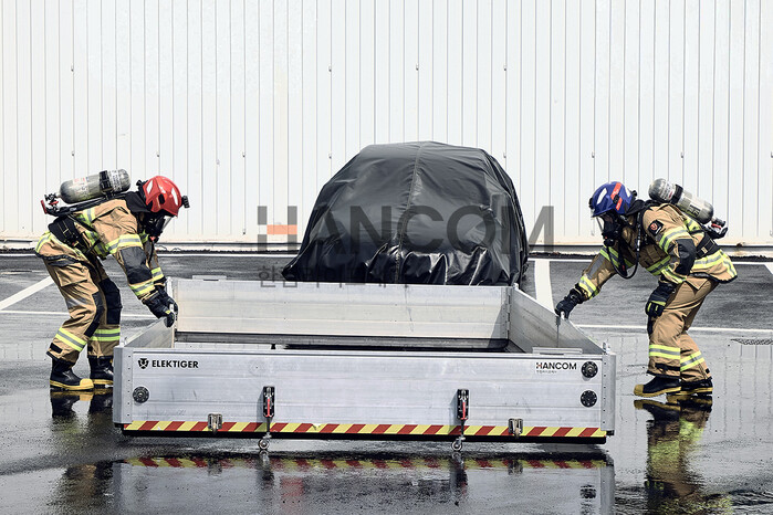 특히, 전기차 화재 시 차량 하부 배터리의 열 폭주를 차단하는 ‘이동식 침수조’가 포함됐다. 이 장비는 전기차 화재 대응의 최종 단계에 적용되는 최신 솔루션으로, 2인 1조 기준으로 약 15초 만에 설치가 가능하다.