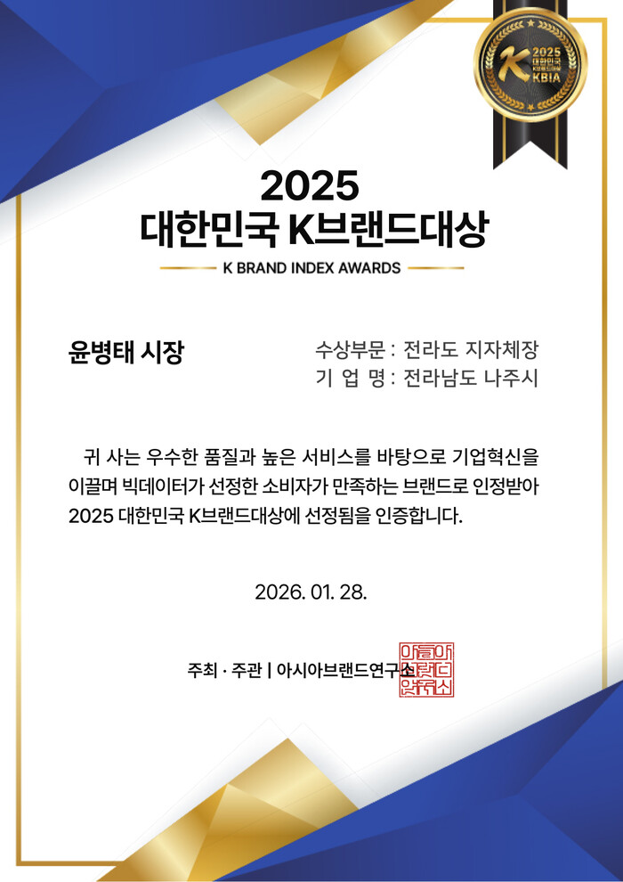 윤병태 나주시장은 “2025 대한민국 K브랜드대상을 수상하게 되어 매우 뜻깊게 생각한다”며 “이번 수상은 나주시의 명성과 가치를 함께 만들어 주신 시민 여러분과 현장에서 묵묵히 애써주신 공직자 여러분 모두의 성과”라고 공을 돌렸다.