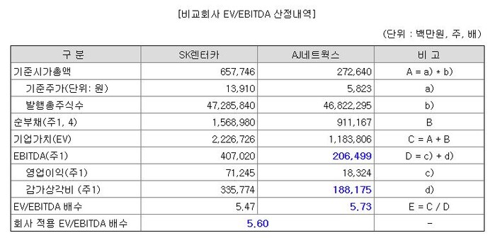 정정신고서에 따르면, 롯데렌탈은 AJ네트웍스의 EBITDA 산정 시 비경상적 손익으로 발생할 수 있는 왜곡을 최소화하기 위해 중단영업손익을 제외시켰다. 최초 산출된 AJ테트웍스 EBITDA가 낮아지면서 결과적으로 기존 EV/EBITDA 배수인 5.44배보다 높은 5.73배를 받게 된 것이다.