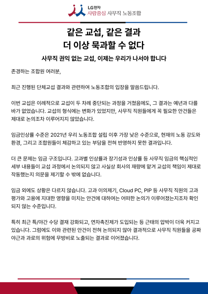 노조의 반발도 거세다. LG전자 사람중심 사무직 노동조합(이하 노조)은 성명문을 통해 "이번 교섭은 두 차례 중단되는 과정을 거쳤음에도 예년과 다를 바 없는 결과로 마무리됐다"며 "임금 인상률은 노조 설립 이후 가장 낮은 수준으로, 노동 강도와 조합원 체감 부담을 반영하지 못했다"고 지적했다.