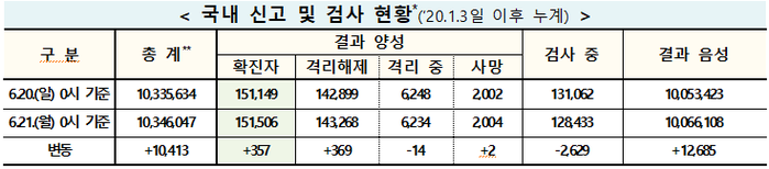 중앙방역대책본부(방대본)는 21일 0시 기준으로 신규 확진자가 357명 새롭게 발생해 누적 확진자수는 15만1506명(해외유입 9568명)으로 집계됐다고 밝혔다.