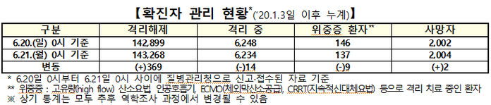 ▲ 21일 0시 기준 코로나19 확진자 관리 현황. [출처=중앙방역대책본부] |