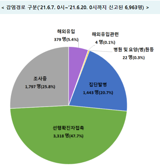 ▲ 6월 7일 0시부터 20일 0시까지 신고된 확진자의 감염경로 구분. [출처=중앙방역대책본부] |