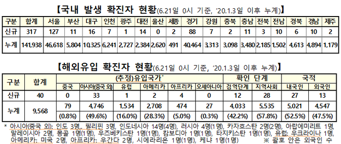 ▲ 21일 0시 기준 코로나19 국내발생 및 해외유입 현황. [출처=중앙방역대책본부] |