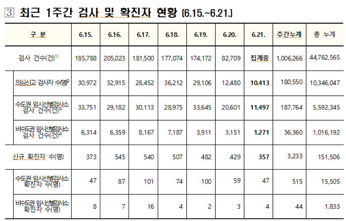 ▲ 최근 1주간 검사 및 확진자 현황. [출처=중앙방역대책본부] |