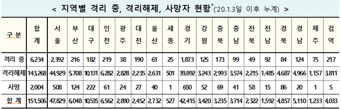▲ 21일 0시 기준 지역별 격리자 및 사망자 현황. [출처=중앙방역대책본부] |