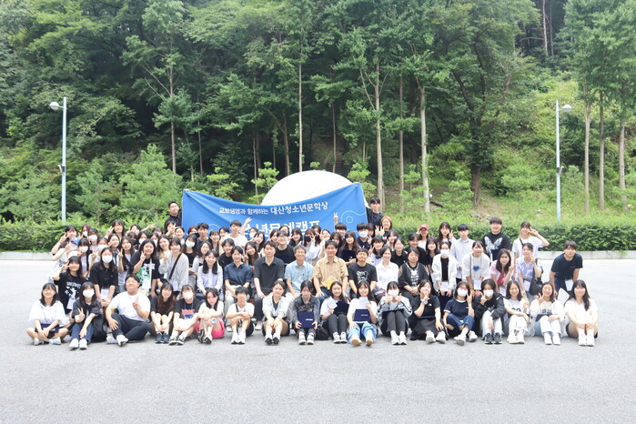 | ▲지난해 7월 충남 천안 교보생명 계성원에서 열린 ‘대산청소년문예캠프’에서 참석자들이 기념촬영을 하고 있다. [사진=교보생명 제공] |