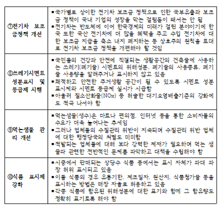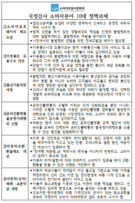 소비자단체가 제안한 10대 정책과제는 소비자 보호와 예방, 분쟁 조정, 안전 등 시민들의 삶의 질에 직접적인 영향을 미치는 의제들이다. 최근 소비자들의 관심이 높아진 자동차 교환환불 제도, 쓰레기 시멘트 환경문제, 식품표시제 등 일상생활 속에서 발생하는 소비자 문제도 정책과제에 반영했다.