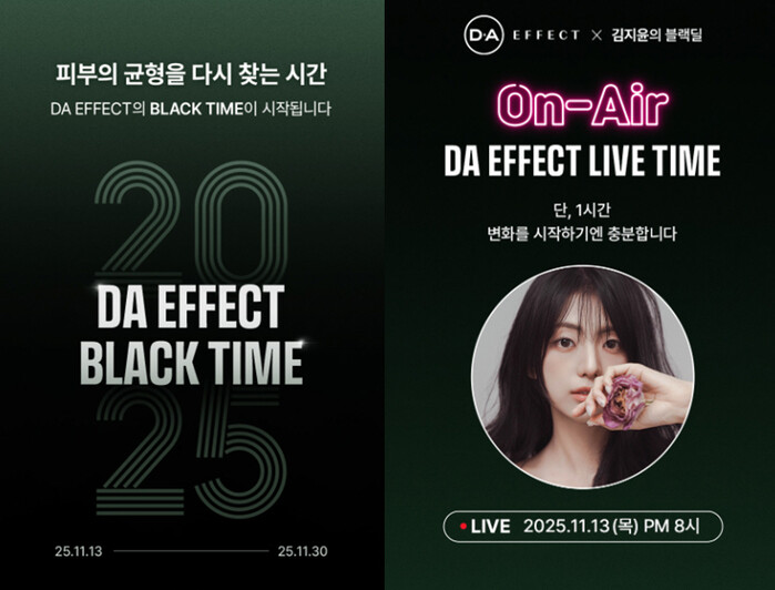 디에이이펙트는 이번 블랙딜을 시작으로 연말 쇼핑 시즌 프로모션의 포문을 연 뒤, 브랜드 공식 홈페이지를 통해 ‘디에이이펙트 블랙타임’ 프로모션도 이어간다. 공식 홈페이지 한정으로 구매 금액대별 사은 이벤트도 준비됐다. 구매자 전원 마스크팩 1매를 증정하며, 15만원 이상 구매 시 2만 9000원 상당의 마스크팩 5매, 20만원 이상 구매 시 3만 9000원 상당의 선 스크린, 30만원 이상 구매 고객에게는 13만 2000원 상당의 선물 패키지를 증정한다.