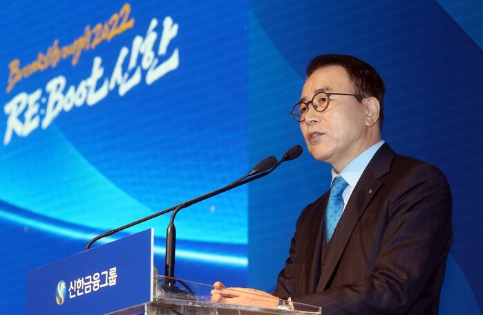 올해 그룹 경영 슬로건으로는 △디지털 생태계 선도 △금융으로 세상을 이롭게 △Breakthrough 2022, 신한의 재창업을 말했다.