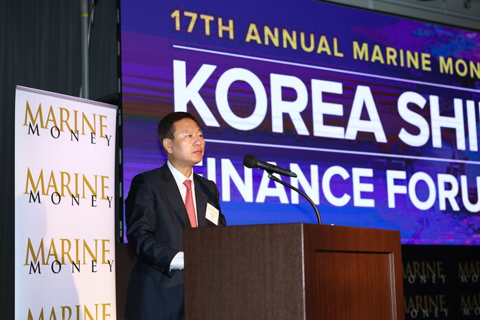 | ▲ 김영진 산업은행 부행장이 2일 부산 파라다이스호텔에서 주최한 '제17회 Annual Korea Ship Finance Forum'에서 기조연설하고 있다. [사진=한국은행] |