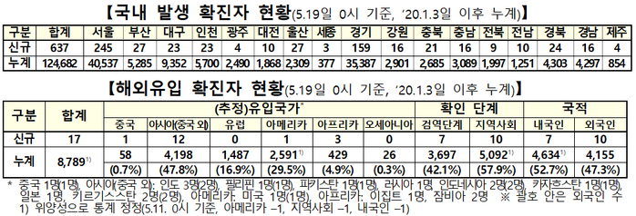 ▲ 19일 0시 기준 코로나19 국내발생 및 해외유입 확진자 현황. [출처=중앙방역대책본부] |