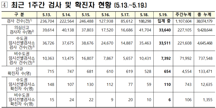 ▲ 최근 1주간 검사 및 확진자 현황. [출처=중앙방역대책본부] |