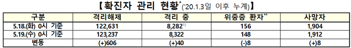 ▲ 19일 0시 기준 코로나19 확진자 관리 현황. [출처=중앙방역대책본부] |