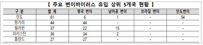 ▲ 18일 0시 기준 주요 변이바이러스 유입 상위 5개국 현황. [출처=코로나19예방접종대응추진단] |