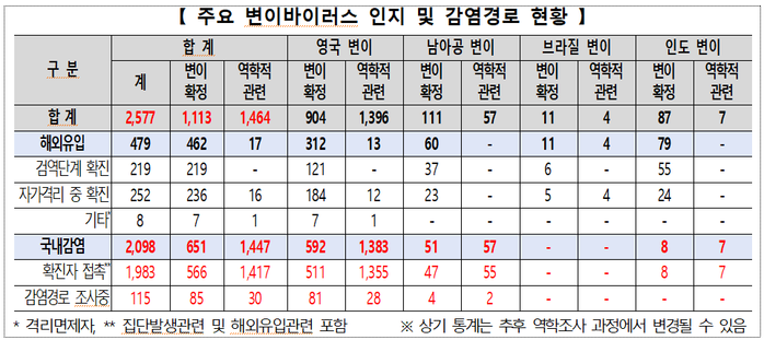18일 0시 기준 주요 변이바이러스 현황을 보면, 확정 1113건·역학적 관련 1464건 등 총 2577건에 이른다. 확정사례만 보면 영국 변이 904건, 남아공 변이 111건, 인도 변이 79건, 브라질 변이 11건 순이다.