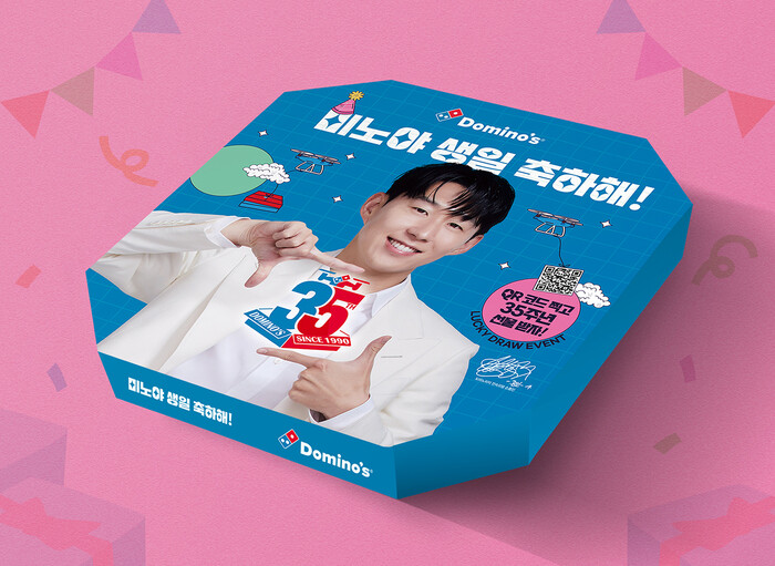 도미노피자가 35주년을 맞아 새롭게 공개한 피자박스에는 도미노피자 모델 손흥민과 35주년 기념 엠블럼이 삽입되어 있다.